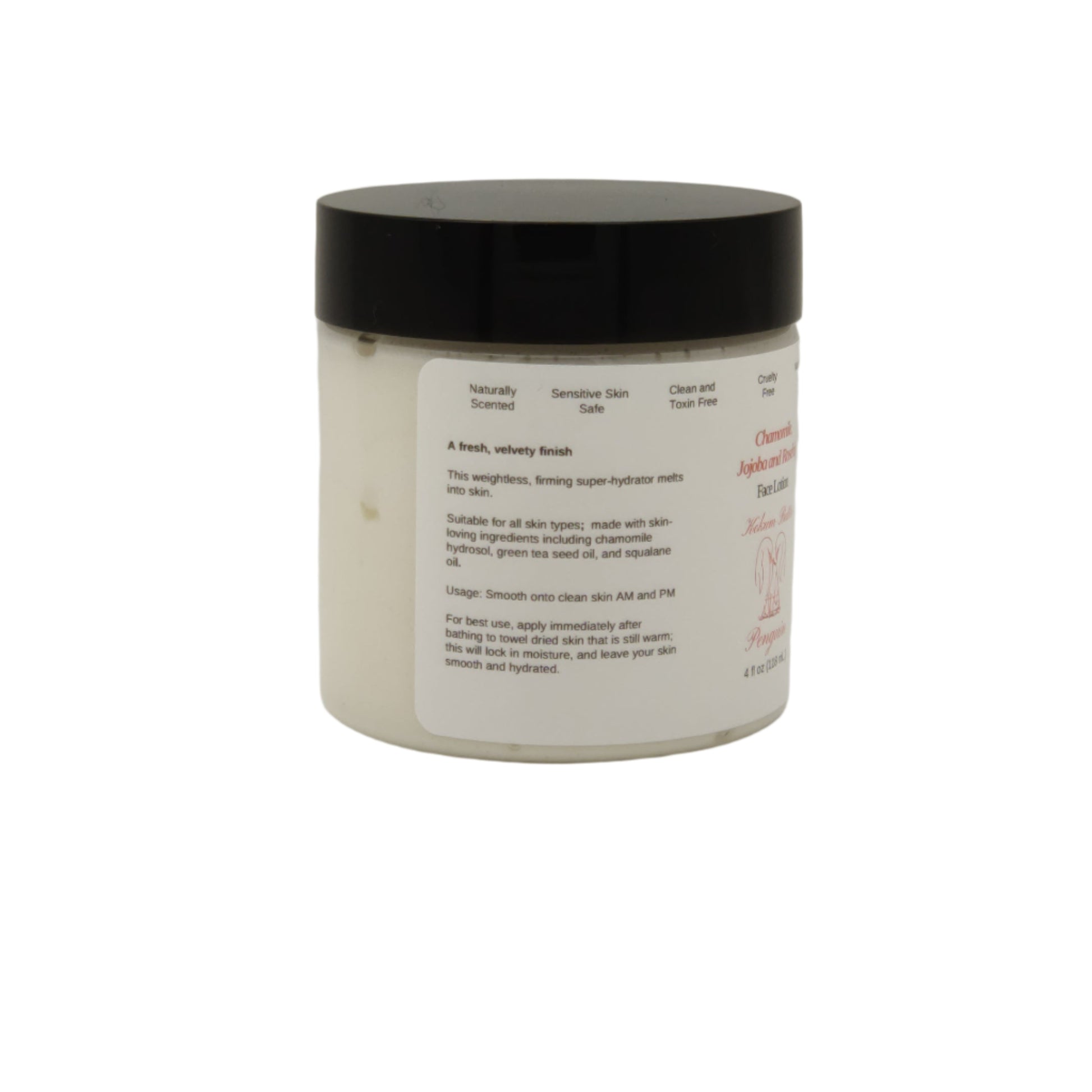 A clean, gentle and nourishing face lotion that is sensitive skin safe. Scented with essential oils.